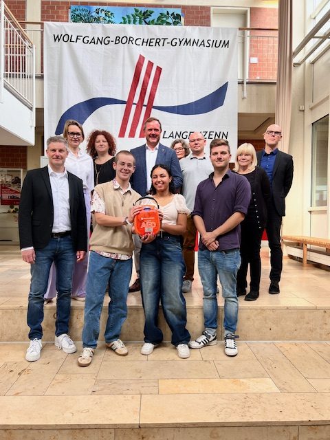 Zu Beginn des neuen Schuljahres freut sich das Wolfgang-Borchert-Gymnasium über die Anschaffung eines neuen Defibrillators. Das kleine Lebensrettergerät wird in der Aula installiert und trägt zu mehr Sicherheit auf dem gesamten Schulgelände bei. Ein besonderer Dank gilt dem Förderverein, der sich maßgeblich für die Realisierung dieses Projektes eingesetzt hat.